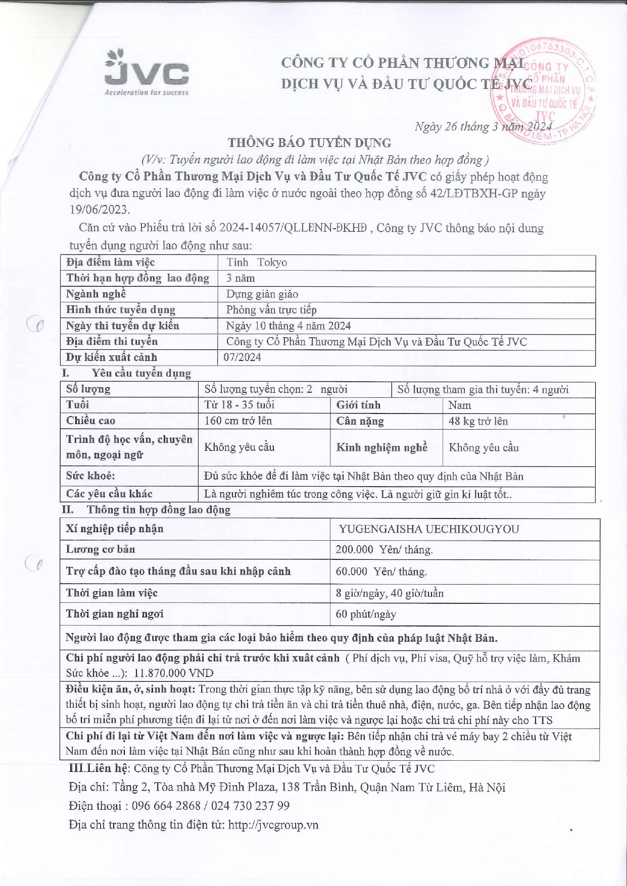 Địa điểm thi tuyển: Công ty Cổ phần Thương Mại Dịch Vụ và Đầu Tư Quốc Tế JVC