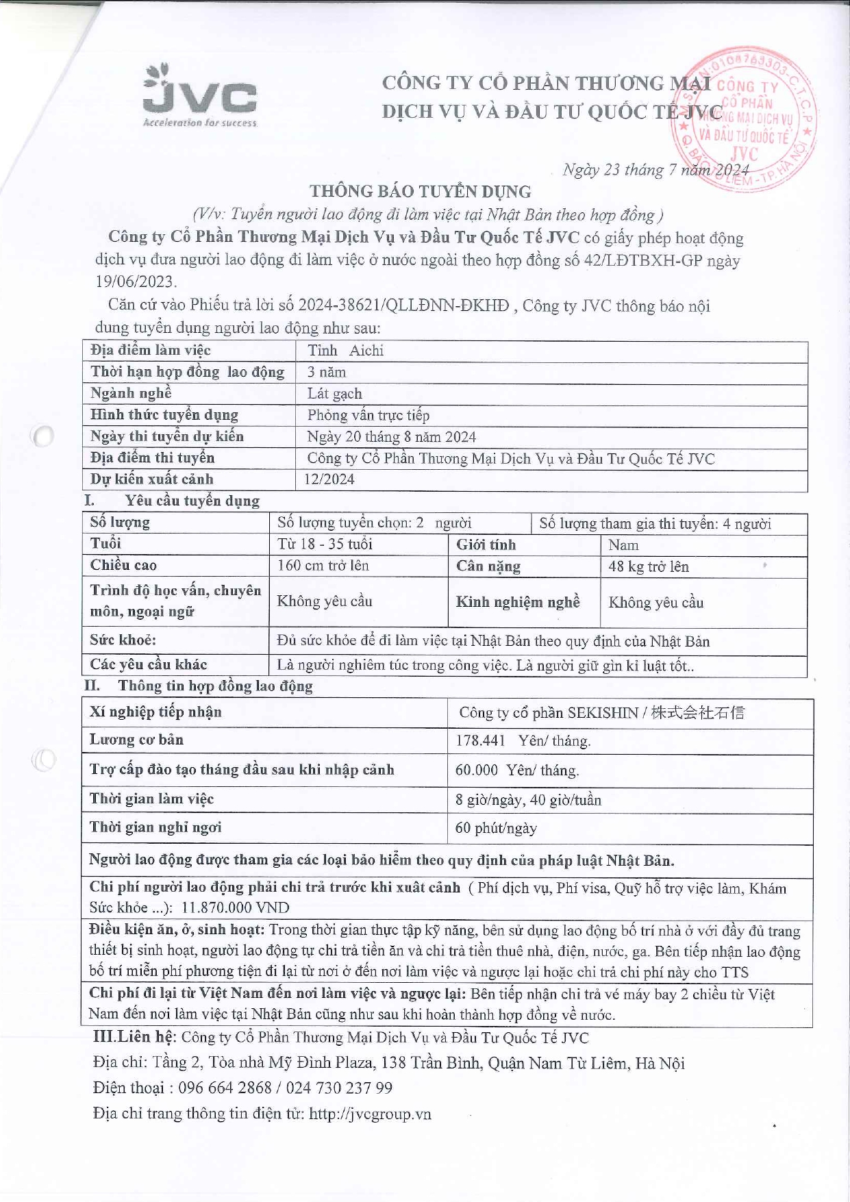 Địa điểm thi tuyển: Công ty Cổ phần Thương Mại Dịch Vụ và Đầu Tư Quốc Tế JVC