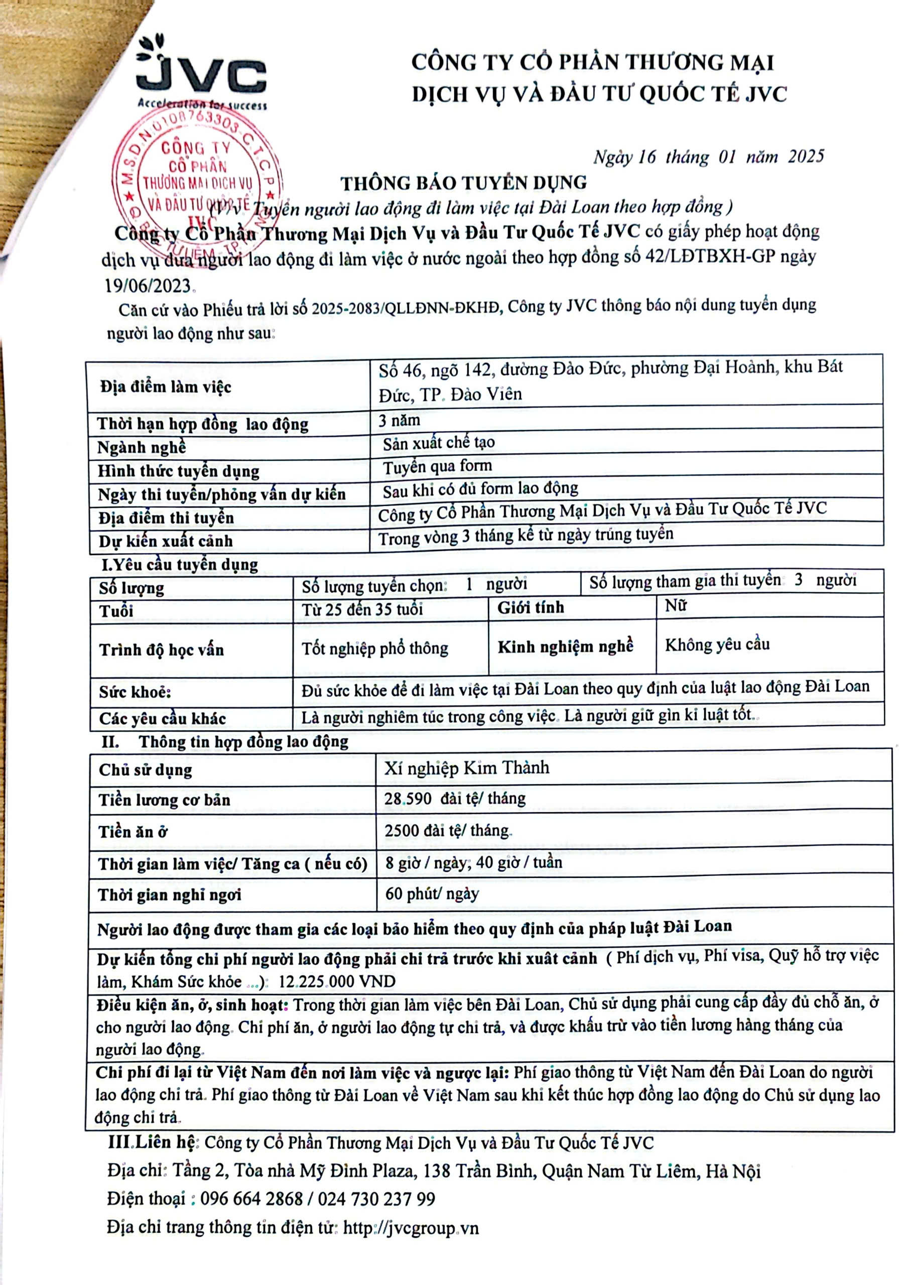 Ngày thi tuyển dự kiến: Sau khi có đủ form lao động