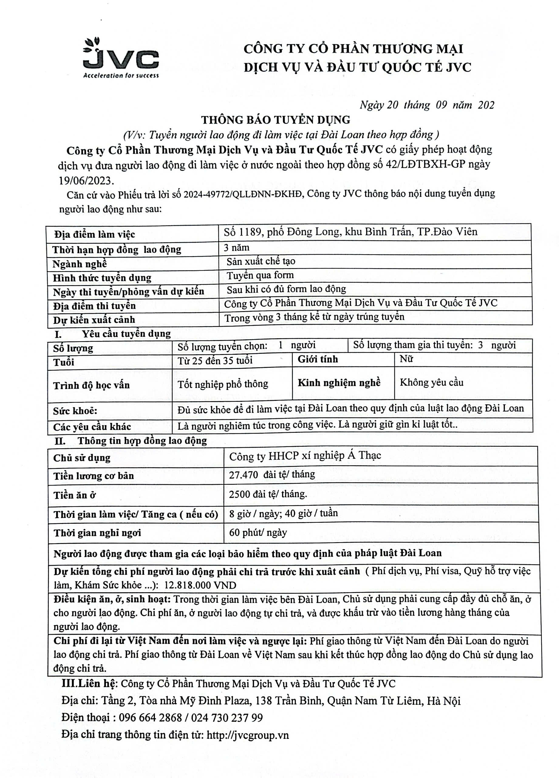 Địa điểm thi tuyển: Công ty Cổ Phần Thương Mại Dịch Vụ và Đầu Tư Quốc Tế JVC