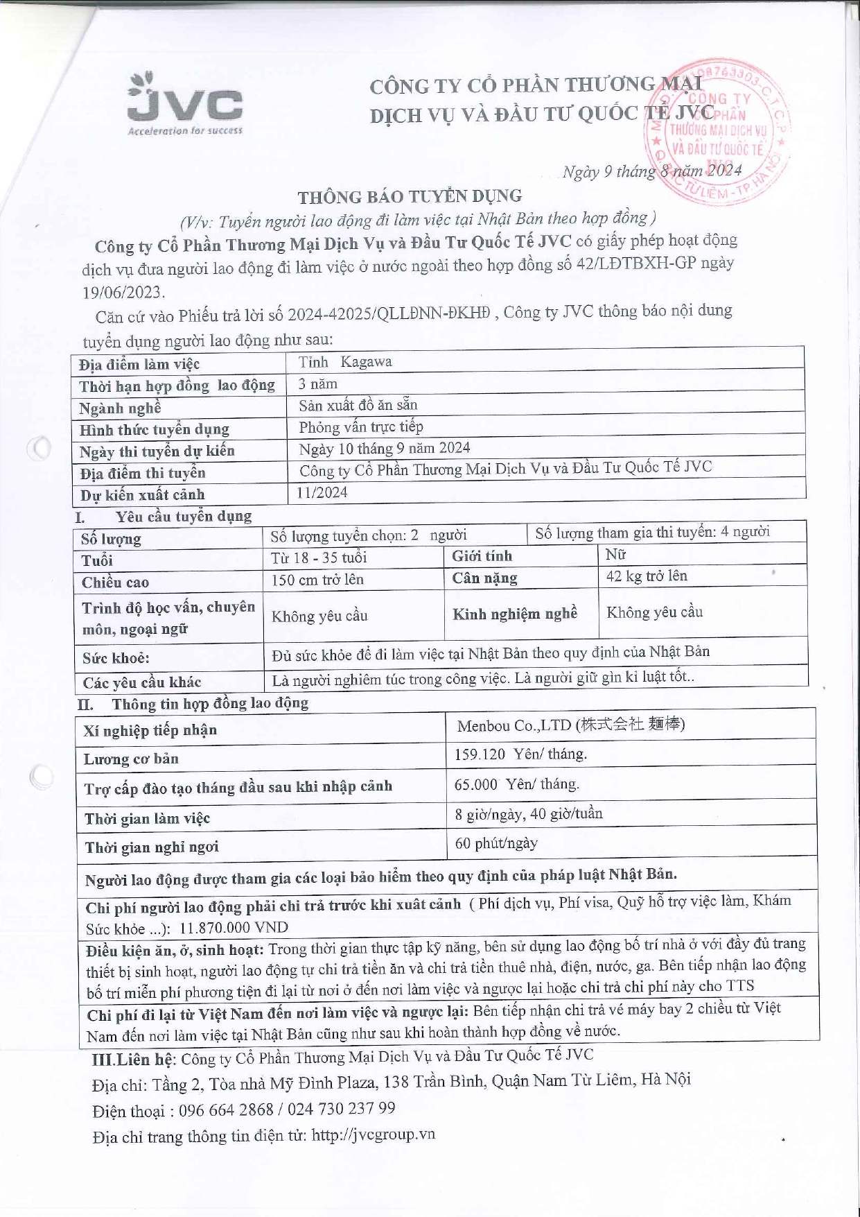 Địa điểm thi tuyển: Công ty Cổ phần Thương Mại Dịch Vụ và Đầu Tư Quốc Tế JVC