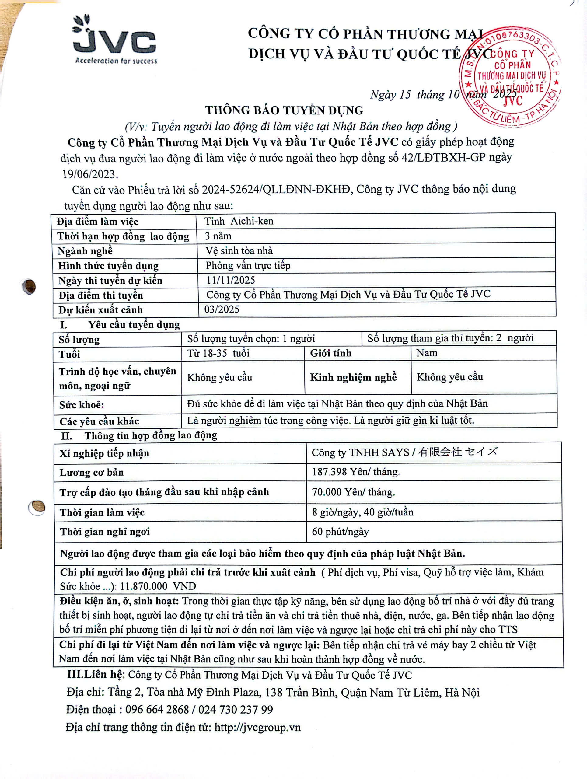 Địa điểm thi tuyển: Công ty Cổ phần Thương Mại Dịch Vụ và Đầu Tư Quốc Tế JVC